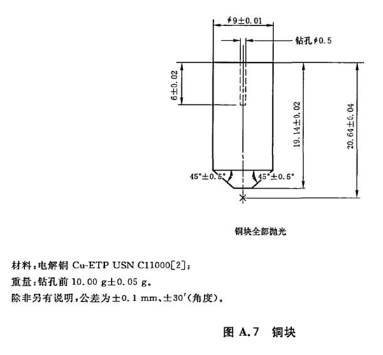 在完成整个机加工但未钻孔的情况下,铜块直径为9mm,质量为10.00g±0.05g,如图A.7所示,应用电解韧铜Cu-ETPUSNC11000【2】制作。