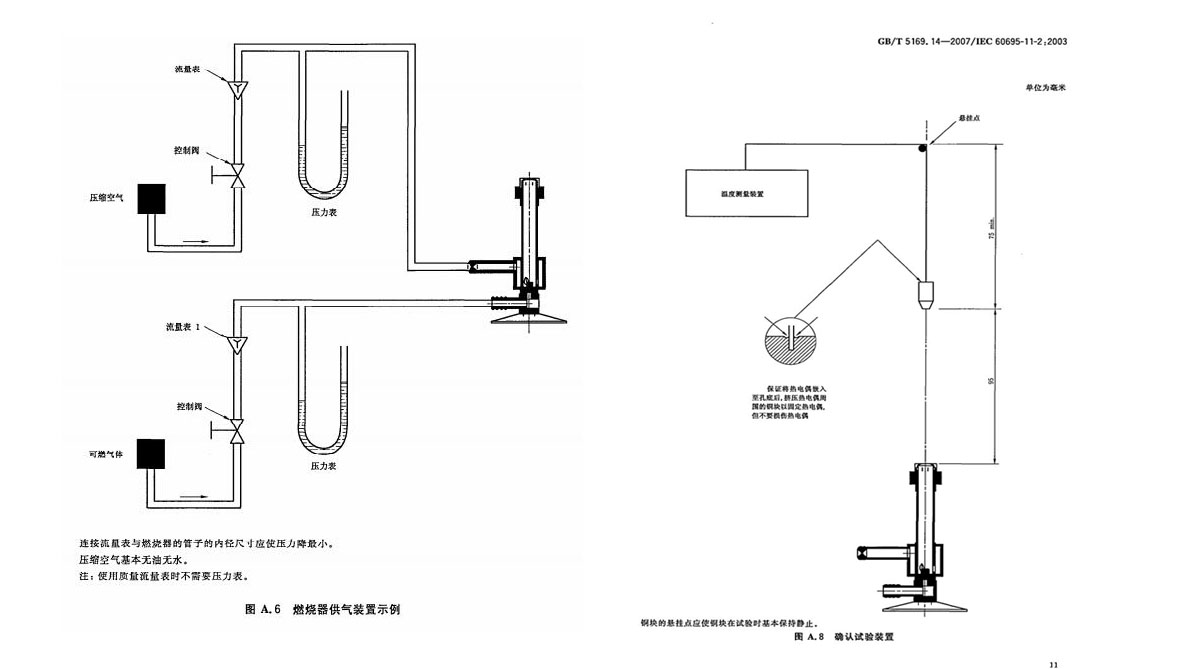 当使用图A.8所示的火焰试验装置时,图A.6所示的铜块的温度从100℃±5℃上升到700℃±3℃所需的时间应为45S±5S。