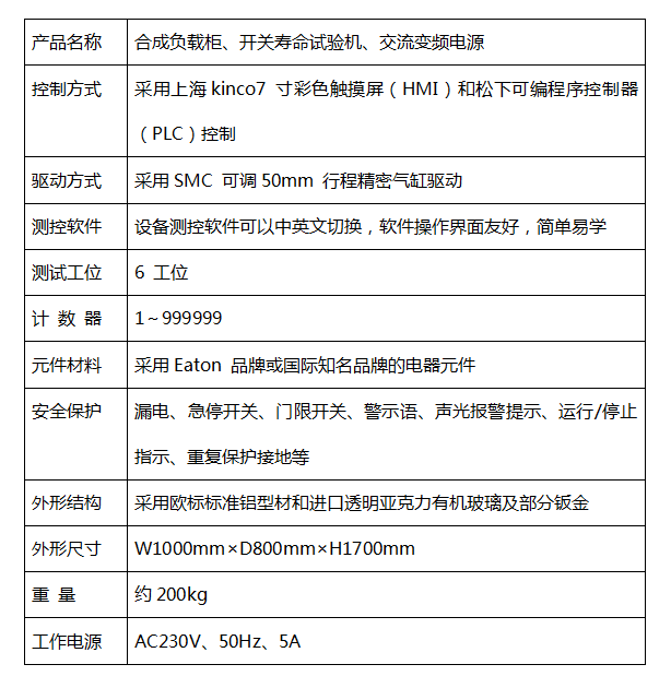 合成负载柜系列是根据IEC60884、GB、VDE、BS、UL61058、IEC884-1和GB2099中的技术要求设计的。本负载试验柜可以为插头插座、开关、家用电器等负载源。本负载柜输出电流电压可调,试验设备装置外型美观,布局合理,操作简单,维护方便等优点。