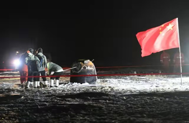 12月17日凌晨,嫦娥五号返回器携带月球样品,采用半弹道跳跃方式再入返回,在内蒙古四子王旗预定区域安全着陆。新华社记者 连振 摄国务委员王勇在北京航天飞行控制中心嫦娥五号任务飞控现场宣读了习近平的贺电。嫦娥五号任务实现了我国首次月面采样与封装、月面起飞、月球轨道交会对接、携带样品再入返回等多项重大突破,其成功实施标志着我国探月工程“绕、落、回”三步走规划如期完成。