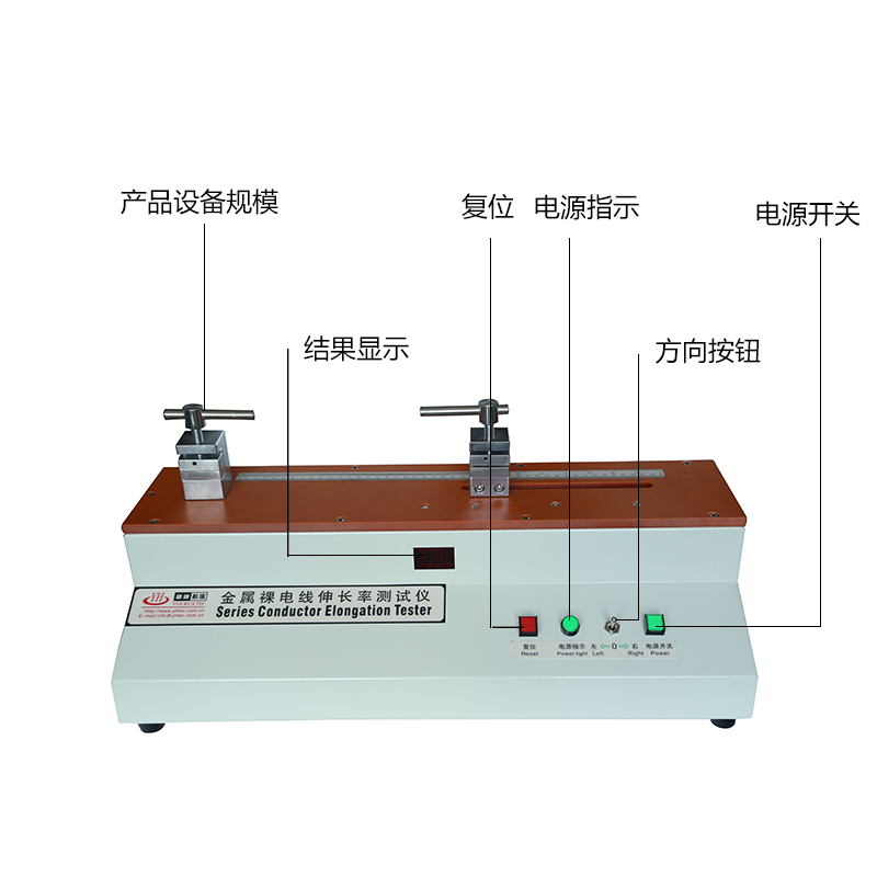 产品描述:伸长率试验仪主要用于检测≤1000N的铝、铜、铁等金属线材的伸长率。采用梯形丝杆和微型交流电机组成的机械传动系统驱动活动夹头以一定的速度产生位移,使夹紧的试样在此拉力作用下逐渐伸长直至拉断,以先进的软体程序设计及精密的电子感测技术来测量试件的拉伸量,LED自动显示试样的伸长率百分数,读取容易、功能精确、操作简单,性能可靠