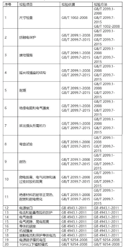 2020年延长线插座(带电源适配器)产品检验项目、依据及方法